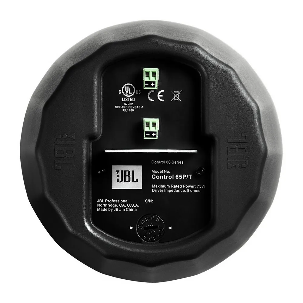 JBL Control 65P/T — подвесной динамик с технологией JBL RBI. Обеспечивает равномерное звучание на 120°. Оснащён НЧ-динамиком 130 мм и твитером 20 мм. Монтажная система с креплением в одной точке. Доступны чёрный и белый цвета.