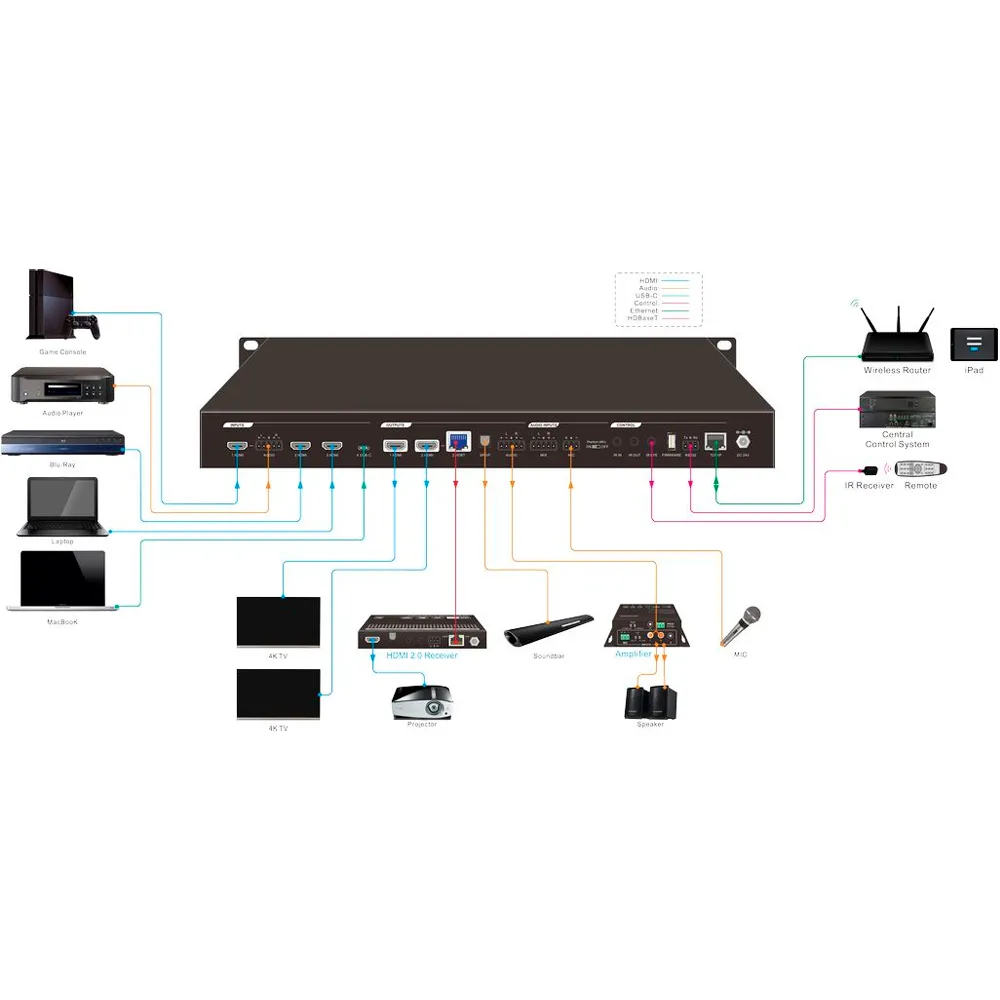 - Входы: x3 HDMI (ver. 2.0), x1 USB-C, х2 аудио Phoenix 5p, х1 аудио Phoenix 3p.