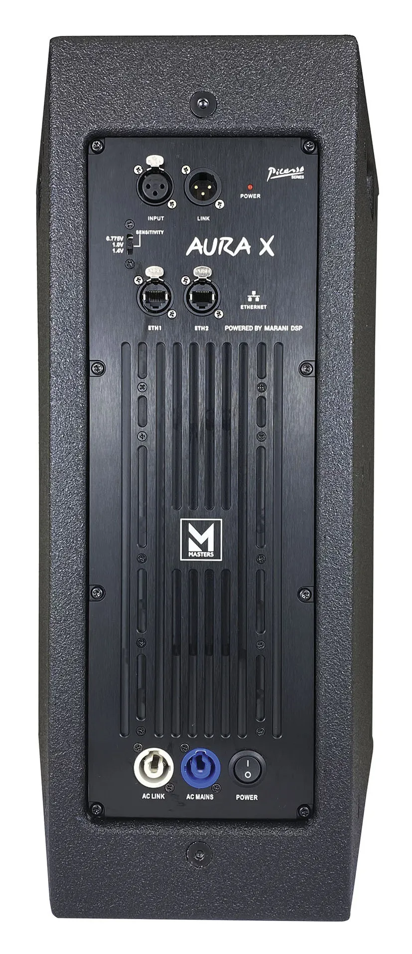 MASTERS AURA X (white) — это профессиональная активная система с DSP-управлением. Мощность: 300 + 55 Вт (AES). Максимальный уровень звука — 128 дБ. Оснащена 10" и 1" динамиками, с раздельным усилением НЧ и ВЧ (BiAmp). В системе используется DSP Masters by Marani с цифровыми инструментами FIR, MIR, IIR, AEQ. Управление через TCP\IP.