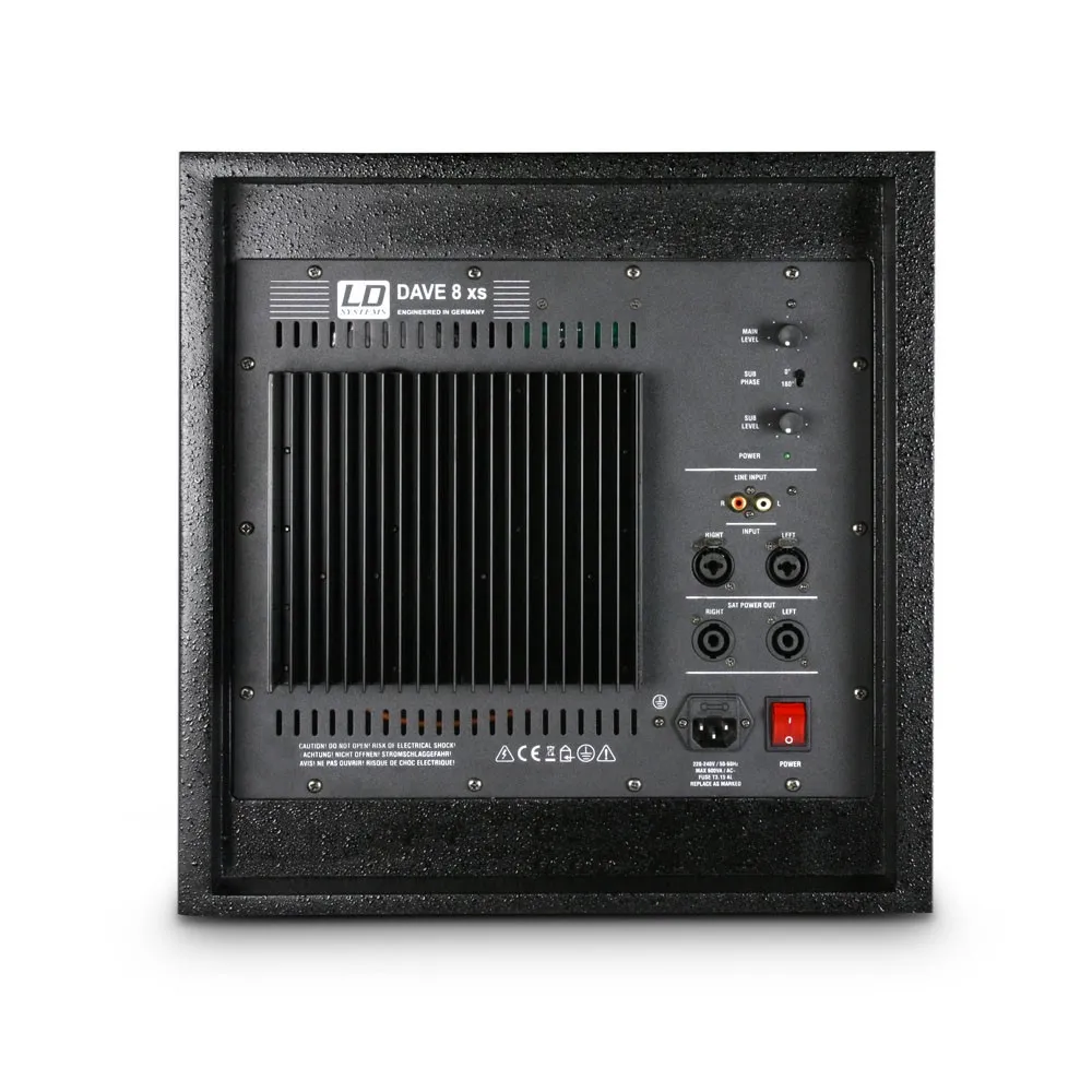 В сабвуфер встроен высокопроизводительный усилитель класса AB. Мультимедийная система LD DAVE 8 XS имеет линейные входы на разъемах XLR и RCA и оснащена всеми стандартными системами защиты. Встроенный лимитер защищает систему от перегрузки и обеспечивает длительный срок службы. На боковой стороне сабвуфера, в дополнение к выключателю ON/OFF и переключателю реверса фазы (180°), имеется отдельный регулятор громкости, который позволяет найти идеальный баланс ярких высоких частот и мощного баса. Сателлиты оснащены 16-мм фланцем и поэтому совместимы со стойками из комплекта DAVE 8 SET 2.