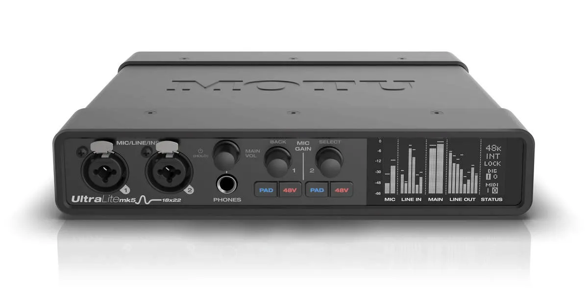 MOTU UltraLite-Mk5 оснащается одними из лучших в своем классе преобразователями. В устройстве применен ЦАП ESS Sabre32 ES9026PRO, динамический диапазон которого составляет 125 дБ, а кг+шум равен -114 дБ. Драйвера для интерфейса были переписаны, благодаря чему производителям удалось добиться рекордных показателей звуковой задержки сигнала (2.4 мс при буфере 32 в режиме 96 кГц).UltraLite-Mk5 может одновременно работать с 40 каналами (18/22), обладает DSP процессором со встроенными эффектами (эквалайзер, ревер, компрессор) и имеет два микрофонных предусилителя с усилением до 75 дБ. Управление большинством настроек звуковой карты возможно из внешнего приложения CueMix, в котором пользователи могут изменять маршрутизацию каналов, уровни громкости, панораму, а также вызывать эффекты.