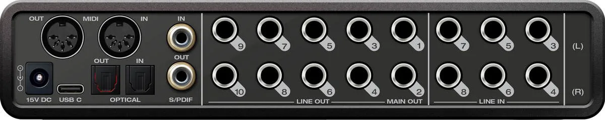Для коммутации предусмотрены: выход для наушников, 2 TRS/XLR входа, 10 TRS выходов, 6 TRS входов, SPDIF In/Out, MIDI In/Out, ADAT In/Out, USB. Питание модели осуществляется от внешнего адаптера. Вместе с аудиоинтерфейсом производитель поставляет программу Performer Lite и коллекции семплов от Loopmasters и Big Fish Audio.