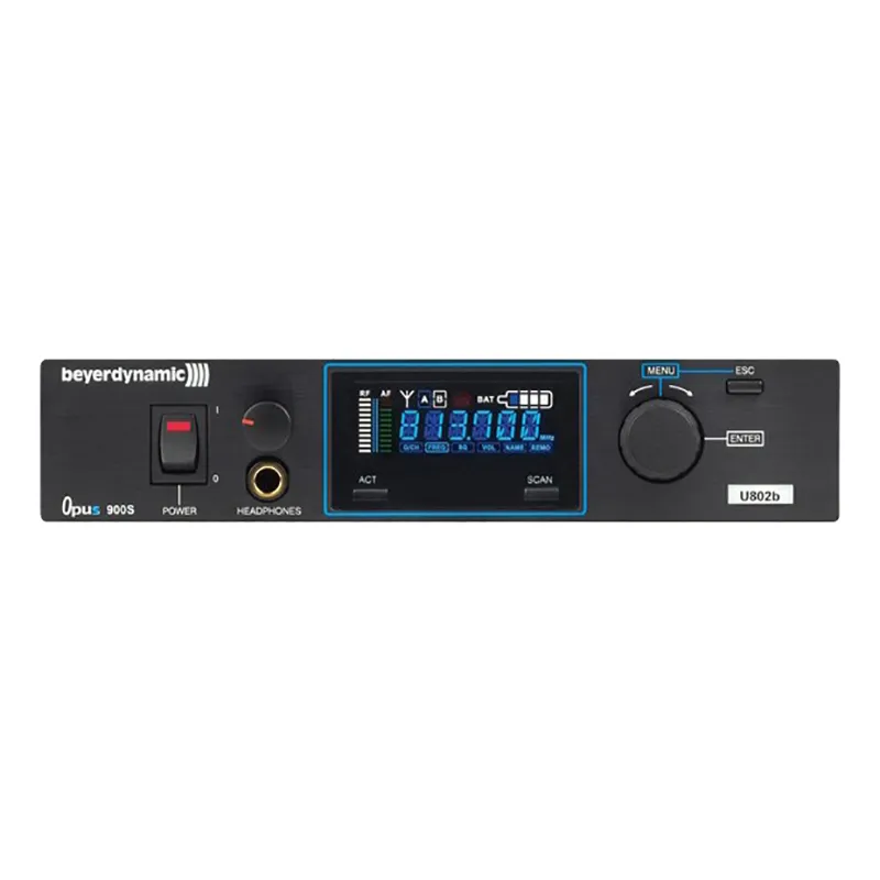 Beyerdynamic NE 900 S (774–798 МГц) — профессиональный приёмник для студий и сцены. Поддерживает 100 предварительно настроенных частот на канал, позволяет управлять до 16 частотами одновременно. Функции SCAN и ACT упрощают поиск частот. Цветной дисплей отображает параметры. Контроллер Pilot tone подавляет помехи.