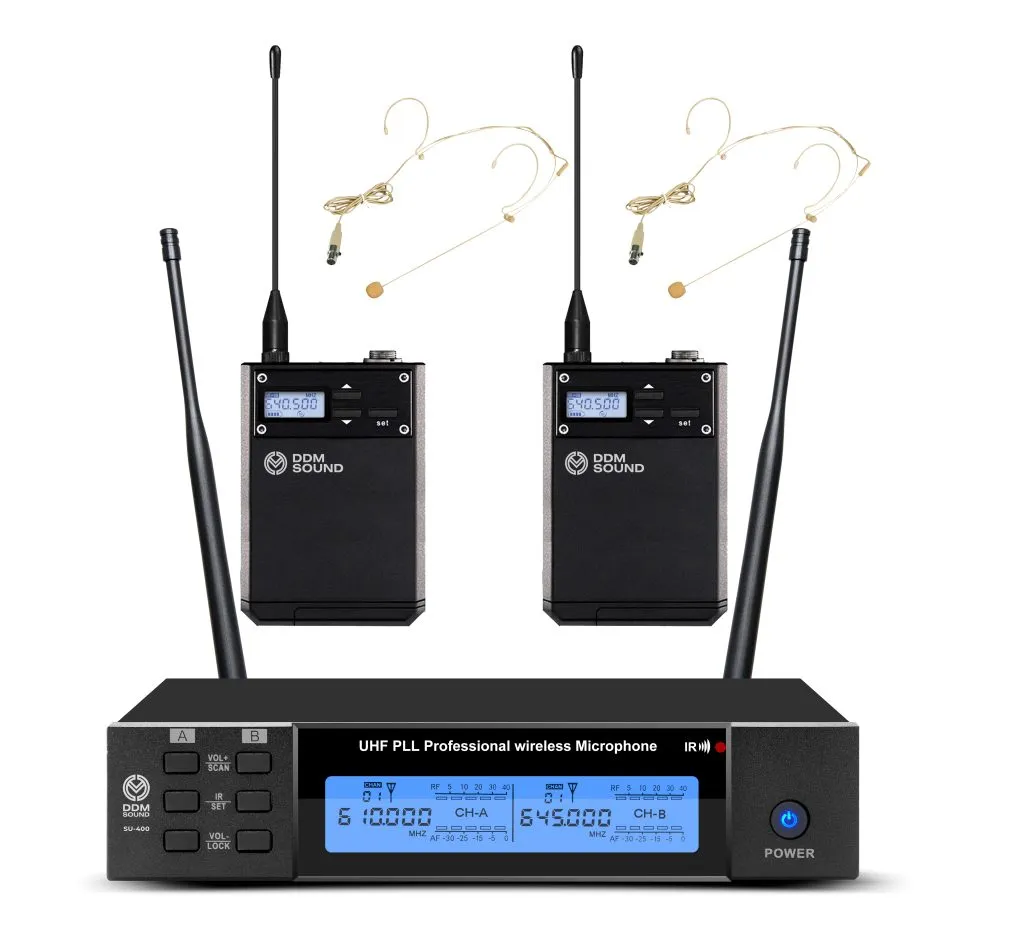 Радиосистема DDM Sound SU-400 — профессиональная головная система для вокалистов и ведущих. Обеспечивает чистую передачу голоса. В комплекте 2 микрофона, передатчика и база-приёмник.