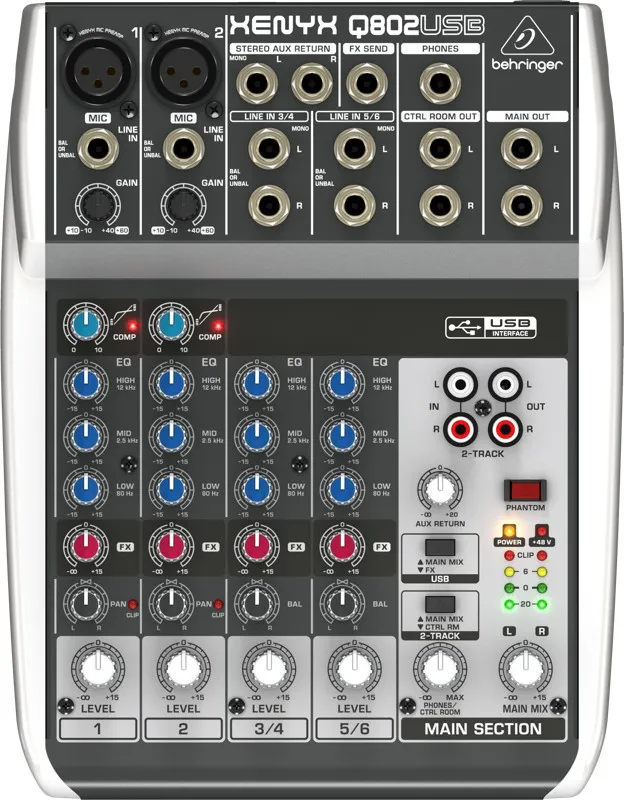 Восьмивходовый, двухшинный BEHRINGER Q802USB способен подключаться к динамическому или конденсаторному микрофону, благодаря имеющемуся фантомному питанию. Воспроизведение музыки между сетами возможно посредством 2-дорожечных входов (основной микс или наушники/микрофоны), запись же звука на встроенное устройство записи осуществляется через выход ы RCA.