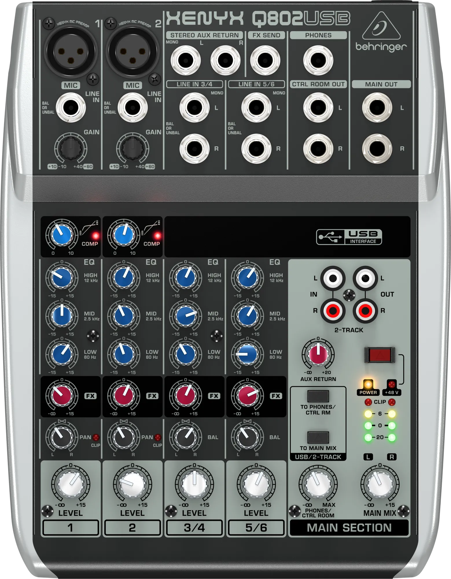 BEHRINGER Q802USB – это сверхкомпактный микшер с восемью входами (2 микрофонных, 2 стерео), который позволяет без особых усилий добиться премиум-качества звучания за счет двух встроенных микрофонных предусилителей XENYX студийного класса, а также ультра музыкального «британского» канального эквалайзера. В то же время простые в использовании компрессоры обеспечивают полный динамический контроль за качеством конечного результата, сохраняя все силы и эмоции, которые пользователь вкладывает в каждую ноту. Добавьте к этому качества указанного выше эквалайзера и абсолютную простоту в использовании системы и получите BEHRINGER Q802USB – универсальный микшер для живых выступлений.Но BEHRINGER Q802USB также предназначен не только для использования на концертах. Микшер оснащен рядом высокотехнологичных инструментов, необходимых для конструирования записей с потрясающим качеством звучания. Наряду со встроенным USB / аудио интерфейсом, BEHRINGER Q802USB оснащен всем необходимым для полноценной работы программным обеспечением записи и редактирования треков. Создание полноценной звукозаписывающей студии у себя дома – это реальность с BEHRINGER Q802USB.