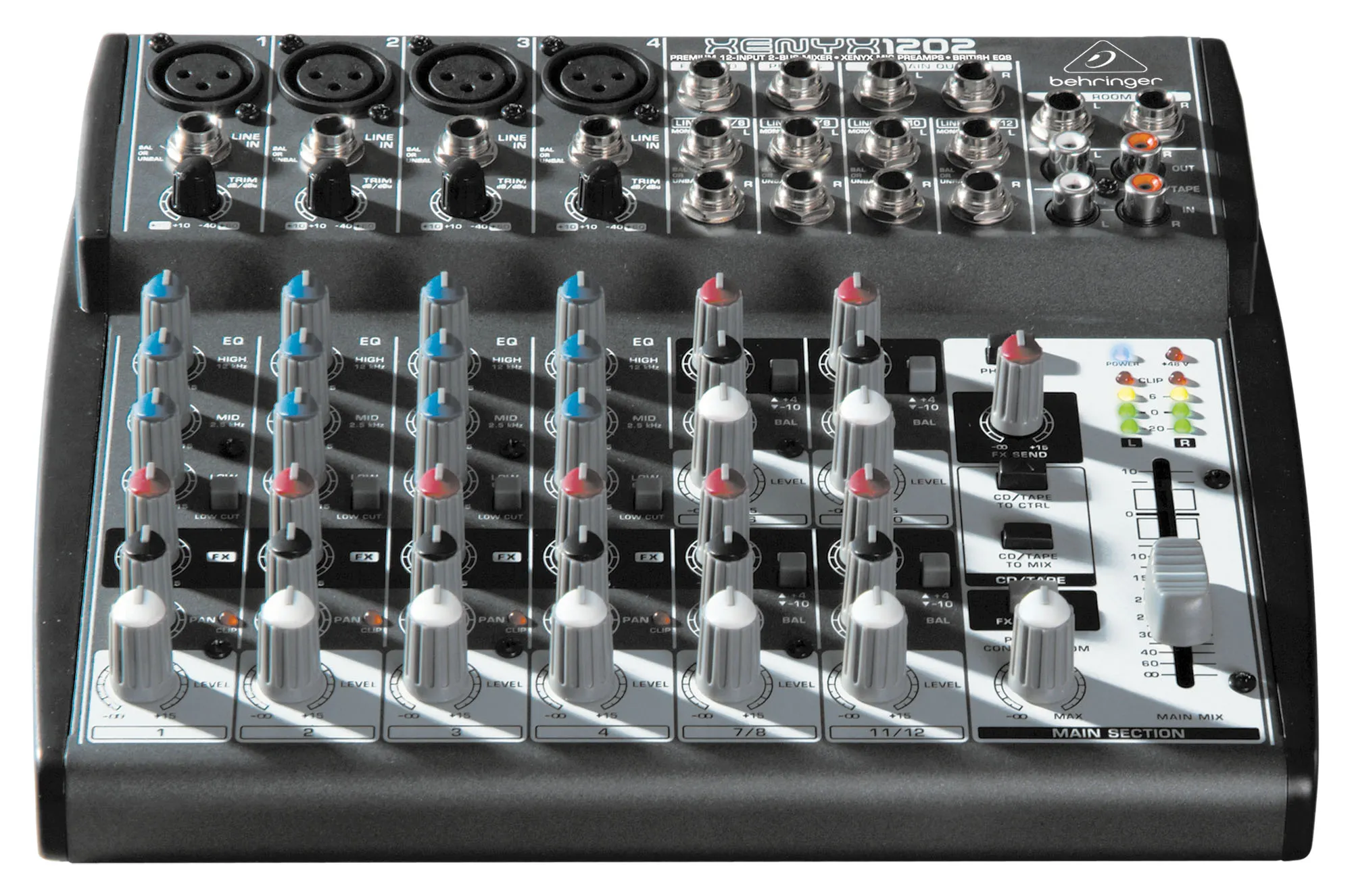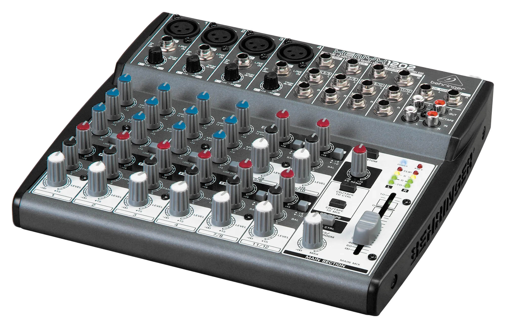 Микшерный пульт Behringer XENYX 1202 – компактный настольный аналоговый микшер премиум-класса. Имеет 12 моно-входов, 4 стереоканала, 4 микрофонных входа с разъёмами XLR.