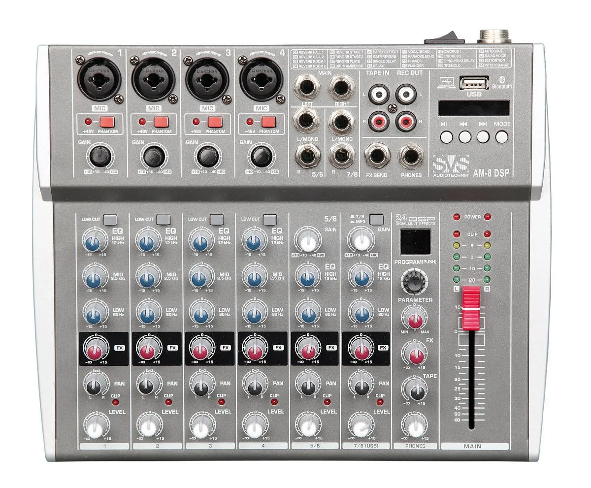 Микшерный пульт SVS Audiotechnik AM-8 DSP — это аналоговый 8-канальный микшер с 24 DSP-эффектами и USB-интерфейсом. Имеет современный дизайн, удобный интерфейс, 3-полосный эквалайзер и низкий уровень шума. Оснащён моно- и стерео входами, поддержкой фантомного питания и MP3-плеером с функцией записи. Вес: 1,41 кг.