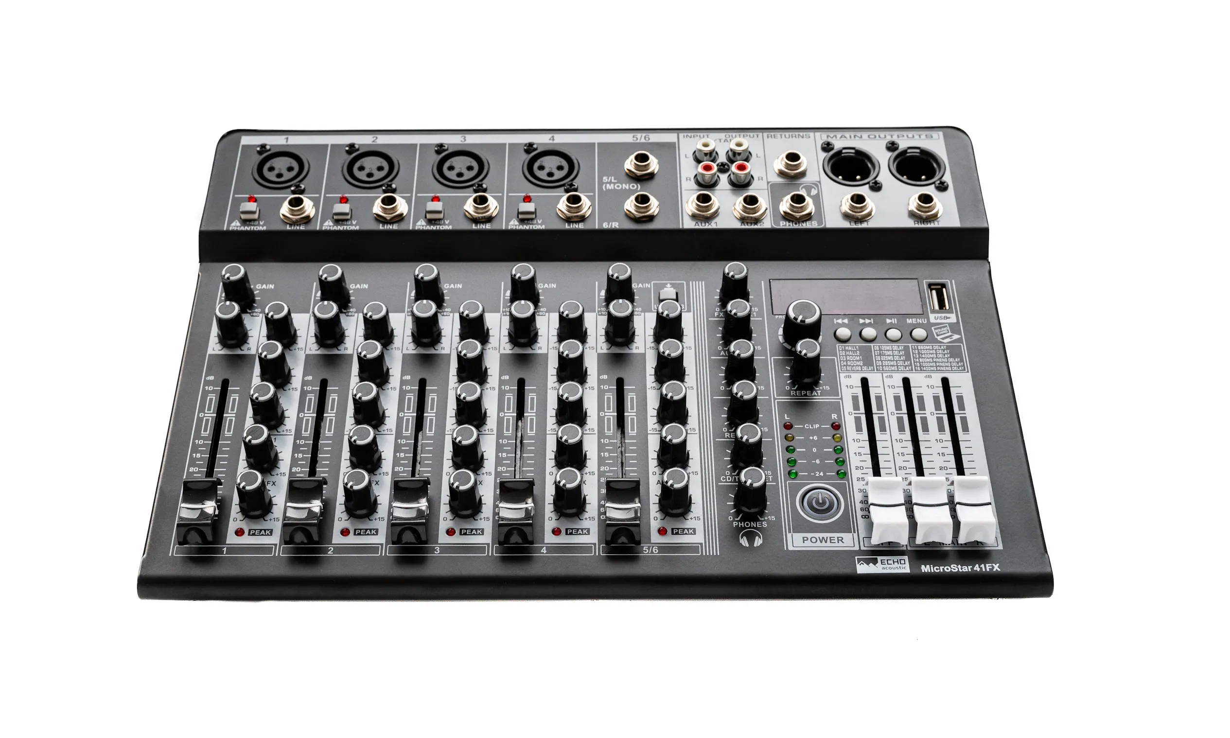 Echo Acoustic MicroStar 41FX компактный микшерный пульт, 4xMic/Line In, +48V, 1xSt.line In, 2 AUX Out, процессор эффектов, USB-A.Характеристики и возможности