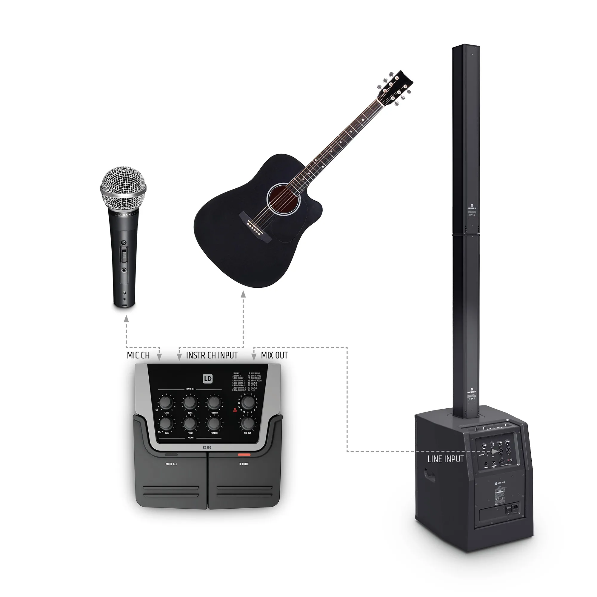 FX 300 оснащен 16 цифровыми пресетами эффектов в 16-битном качестве, двумя входами с отдельной настройкой усиления, а также балансным и небалансным выходами. Фантомное питание +48 В, подаваемое на микрофонный вход, позволяет использовать не только динамические, но и конденсаторные микрофоны. Высокоимпедансный малошумящий инструментальный вход отлично подходит не только для акустической или бас-гитары, но и для любых других инструментов. Большой запас по усилению позволяет не беспокоиться об искаженном сигнале. А благодаря батарее 9 В, заряда которой хватает на пять часов работы, LD Systems FX 300 справится с задачей даже при отсутствии розетки.