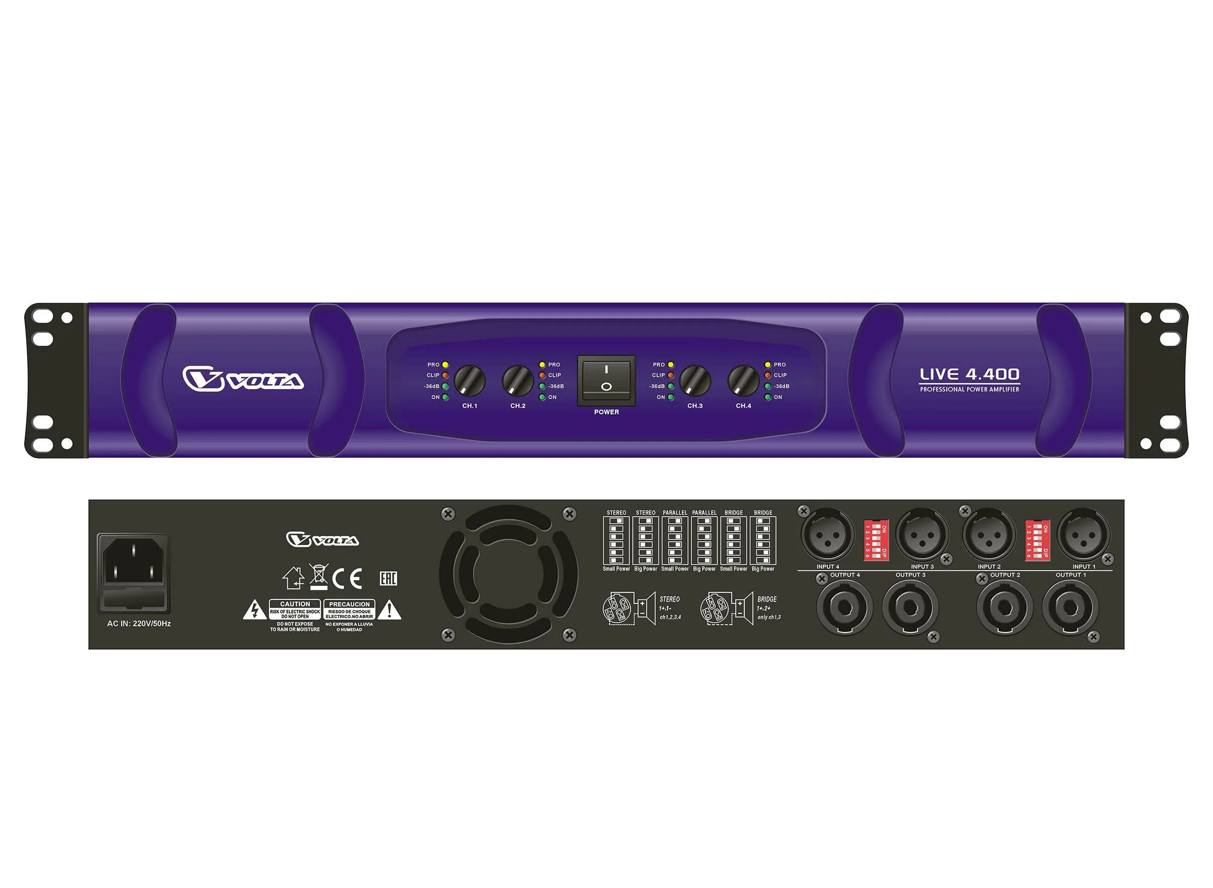 Описание усилителя мощностиУсилитель мощности Volta LIVE 4.400 — профессиональное устройство для стационарных и мобильных звуковых систем. Обеспечивает высокую выходную мощность: 200 Вт x 4 (при 8 Ом), 300 Вт x 4 (при 4 Ом) и 600 Вт x 2 (в режиме моста). Относится к классу D, имеет входное сопротивление 20 кОм и частотный диапазон от 20 Гц до 20 кГц. Коэффициент нелинейных искажений составляет 0,1 %, а отношение сигнал/шум — 103 дБ. Устройство оснащено защитой по постоянному току, от перегрузки, а также функциями мягкого старта и стартового теста.