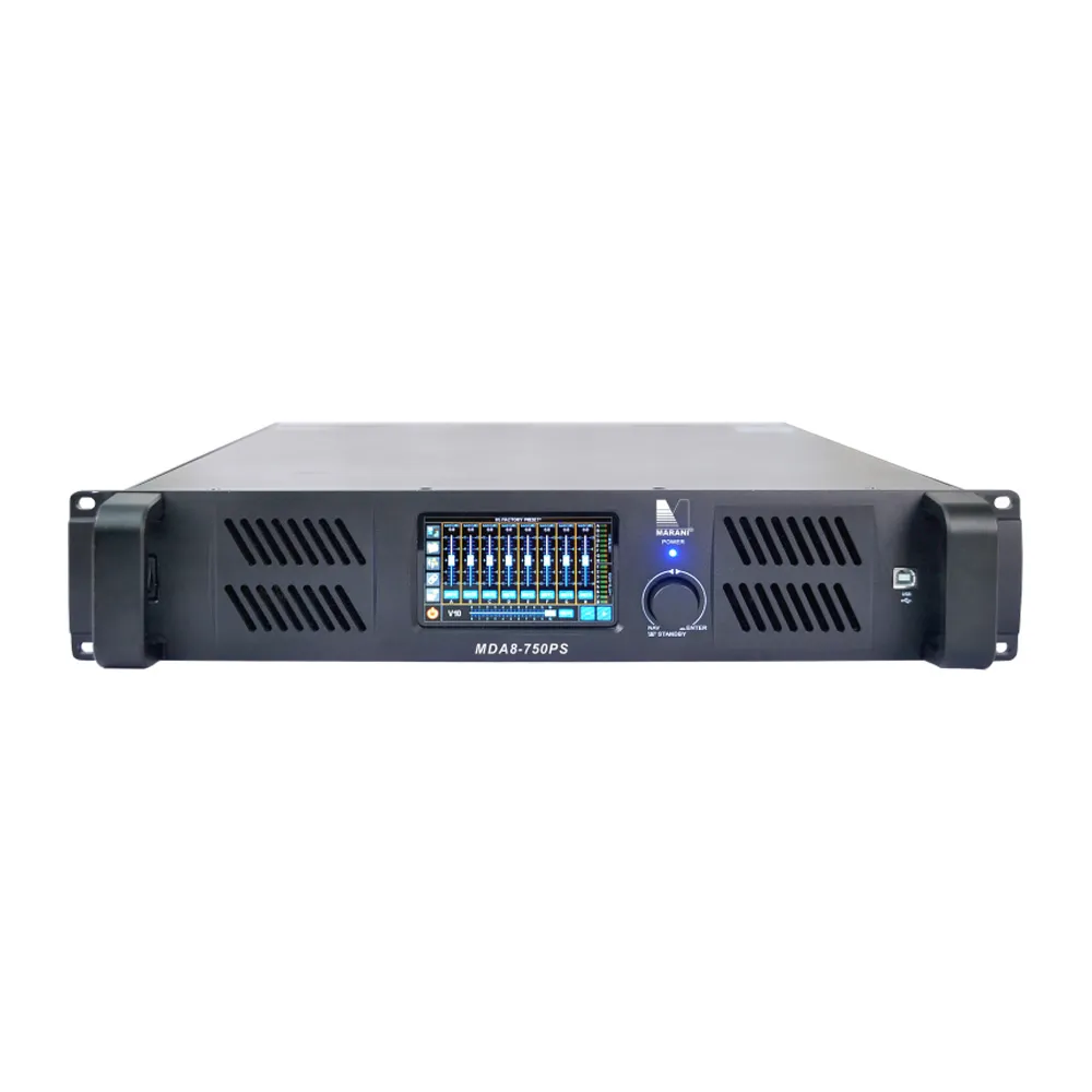 Marani MDA8-750PS — интеллектуальный 8-канальный усилитель мощности от Powersoft. Подходит для требовательных звуковых систем. Обладает высокой выходной мощностью, эффективной системой охлаждения и DSP. Управляется через ПК по USB/Ethernet. Есть защита от перегрева и повреждений динамиков.