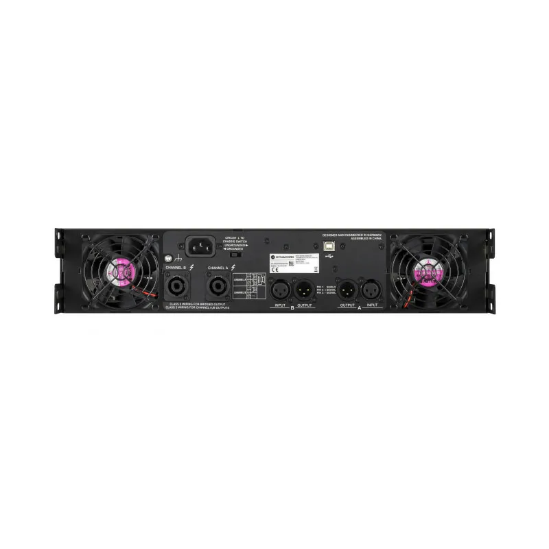 На передней панели также находится LCD-дисплей и органы управления. Реализована возможность удаленного управления усилителем через фирменное программное обеспечение. Мощность усилителя - 2 x 2300 Вт (2 Oм), 2 x 1400 Вт (4 Ом), 2 x 700 Вт (8 Oм). Усилитель оснащен параметрическим многополосным эквалайзером, системой лимитирования звукового сигнала, кроссоверами. Размер для крепления в рек 2U. Размеры усилителя составляют 483 x 88 x 462,4 мм, вес - 16,2 кг.